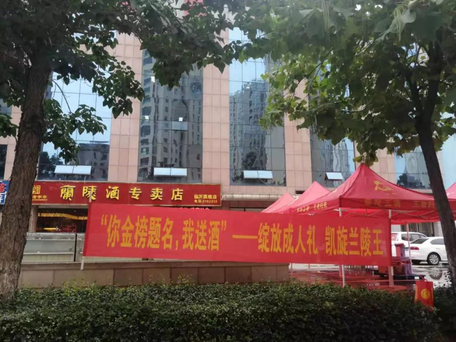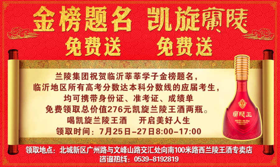2019年7月8日始,兰陵集团在临沂三家广播电台联合播出一则新闻——只要是今年高考过本科线的学子凭有效证件到指定地点均可免费领取两瓶价值276元的凯旋兰陵王酒。