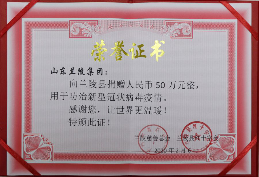 兰陵集团建厂七十多年来在发展自身的同时,还将企业的社会责任扛在肩上,积极投身公益慈善事业。自2004年以来,兰陵集团曾先后为临沂市慈善公益事业捐款千余万元。大事难事见担当,危难时刻显本色。兰陵集团愿和全国人民一起,以实际行动践行初心使命,众志成城、齐心协力打赢这场没有硝烟的防疫之战。